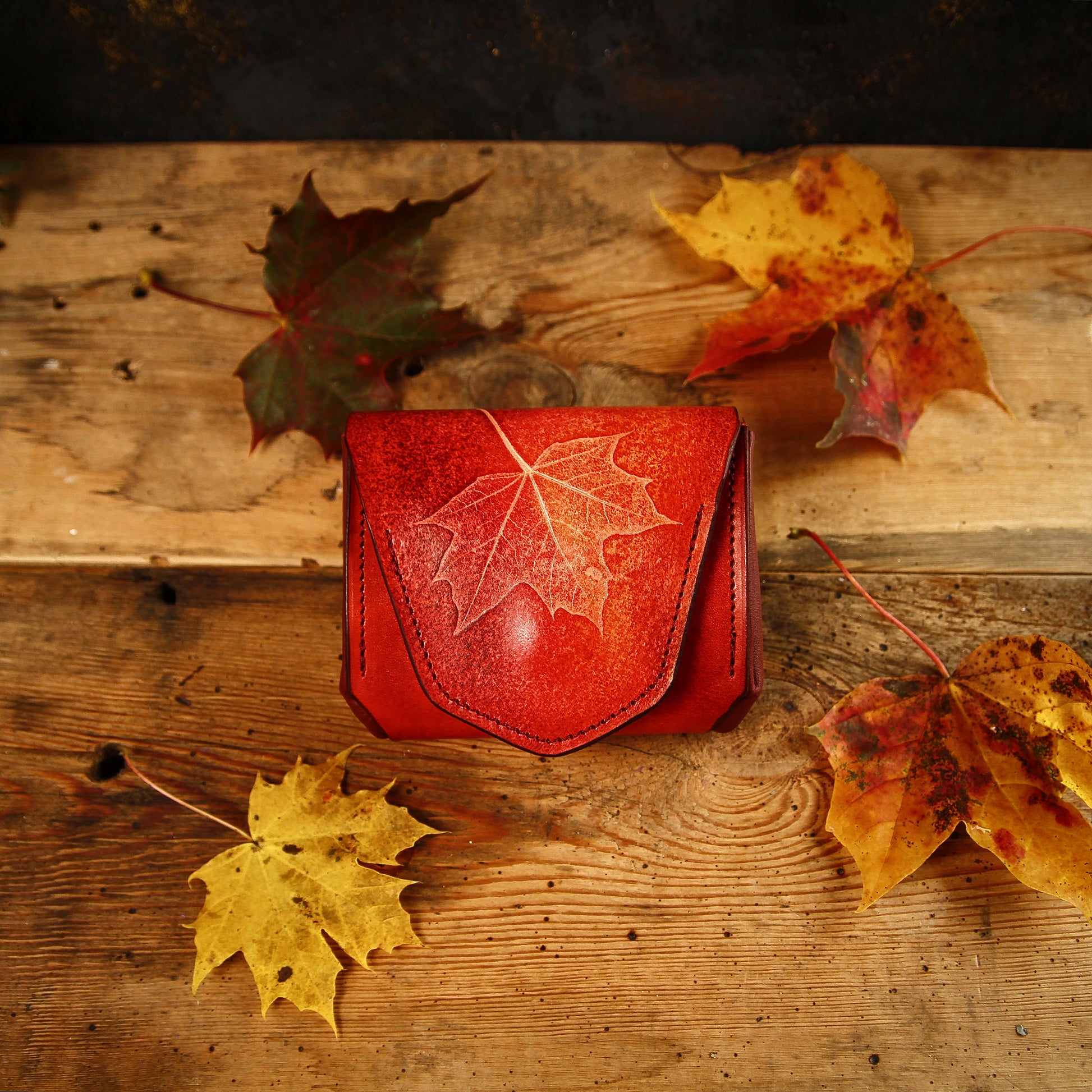 * Geldbörse in herbstlichen Tönen mit Ahornblatt